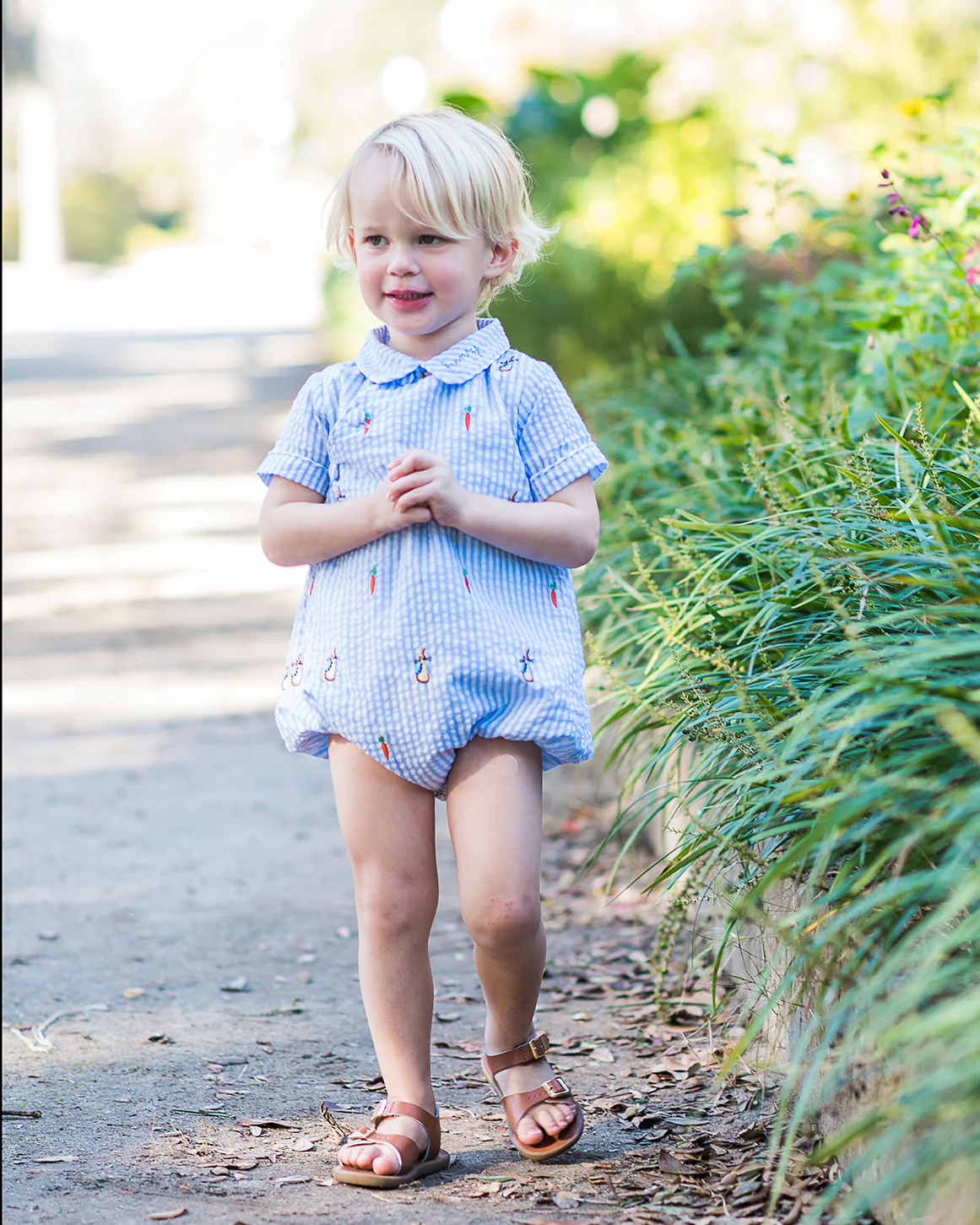 It is all in the details, and we didn't miss one on this classic Easter Wesley bubble. Our blue seersucker bubble has embroidered bunnies and carrots detail with covered buttons along opening for a sweet look just for him. Metal snaps in stride for easy opening and comfort.Â