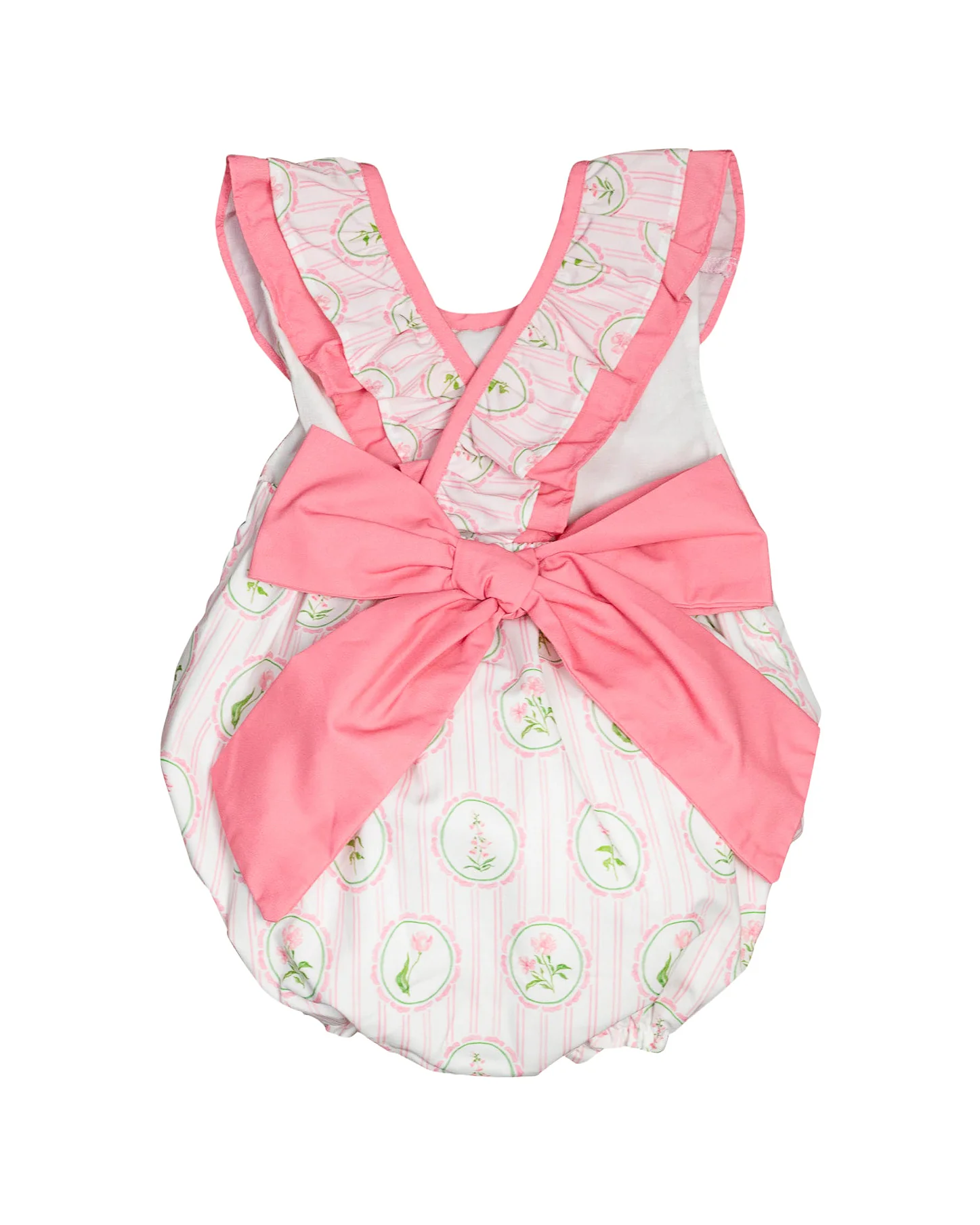 The Josie bubble has a whole new look! Beautiful floral frames print with a pink trim. Deep V in back has a pink bow at the bottom. This bubble is nice and cool for your summer picnic or family reunion. Adjustable straps for the perfect fit. Print is hand painted by Pearly Gates Designs making this a one of a kind bubble!